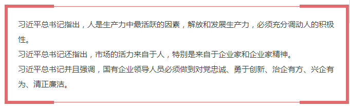 中國特色社會主義進(jìn)入新時代,建設(shè)現(xiàn)代化經(jīng)濟(jì)體系,推動經(jīng)濟(jì)發(fā)展質(zhì)量變革、效率變革、動力變革,需要更好發(fā)揮包括國有企業(yè)家在內(nèi)的廣大企業(yè)家的作用。去年黨中央專門印發(fā)了《關(guān)于營造企業(yè)家健康成長環(huán)境,弘揚(yáng)企業(yè)家精神、更好發(fā)揮企業(yè)家作用的意見》,極大地調(diào)動了企業(yè)家干事創(chuàng)業(yè)的積極性。落實(shí)好中央精神,關(guān)心愛護(hù)企業(yè)家,需要各方面共同努力。