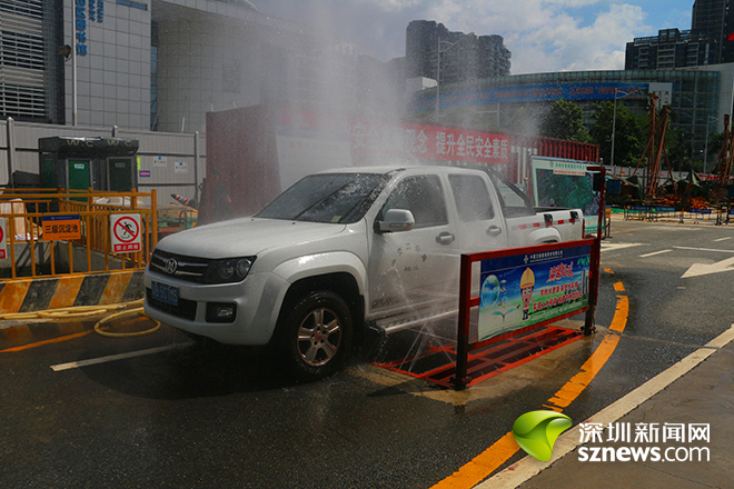 施工單位還利用潛水泵加壓給水管對(duì)車(chē)輛進(jìn)行自動(dòng)沖洗,讓施工車(chē)輛“清爽出門(mén)”,有效防止施工車(chē)輛對(duì)城市環(huán)境的污染。同時(shí),沖洗后的污水經(jīng)排水溝回流到三級(jí)沉淀池內(nèi),經(jīng)過(guò)沉淀處理后進(jìn)入清水池,使水資源循環(huán)利用,從而達(dá)到保護(hù)環(huán)境又節(jié)約成本的目的。