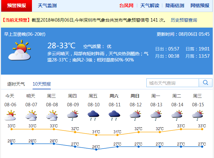多云仍是今日深圳天氣的主格調,部分時間陽光猛烈,局部還會出現短時陣雨或雷陣雨。氣溫較高,最低氣溫在28℃左右,最高氣溫升至33℃左右,北部及人口密集區(qū)的氣溫將達34-35℃。外出應注意防曬,中午前后應減少戶外活動。