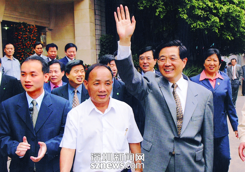 2003年4月12日,胡錦濤同志(前排右一)視察南嶺村,老書(shū)記張偉基(右二)陪同,張育彪也是陪同人員(左一)