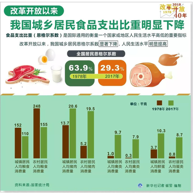 ② 國(guó)家統(tǒng)計(jì)局?jǐn)?shù)據(jù)顯示,改革開放以來,我國(guó)城鄉(xiāng)居民食品支出比重明顯下降。