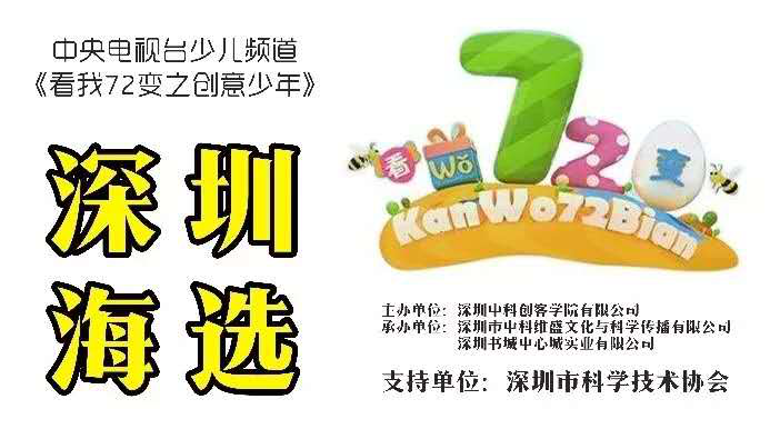 9月15日(本周六),央視“看我72變”欄目組將聯(lián)合深圳市科學(xué)技術(shù)協(xié)會(huì)、深圳市中心書(shū)城、中科創(chuàng)造力實(shí)驗(yàn)室,在中心書(shū)城大臺(tái)階舉辦第10屆“看我72變”之創(chuàng)意少年(深圳賽區(qū))的海選。只要你的孩子有創(chuàng)意有想法,都可以來(lái)到中心書(shū)城參加海選,發(fā)揮自我創(chuàng)意,結(jié)識(shí)新朋友。征集節(jié)目類(lèi)型包括但不限于藝術(shù)創(chuàng)意表演:舞蹈、音樂(lè)、書(shū)法、輪滑、體育類(lèi)等,科技創(chuàng)意:科技作品展示等,優(yōu)勝者將有機(jī)會(huì)登陸央視舞臺(tái)參加節(jié)目錄制。