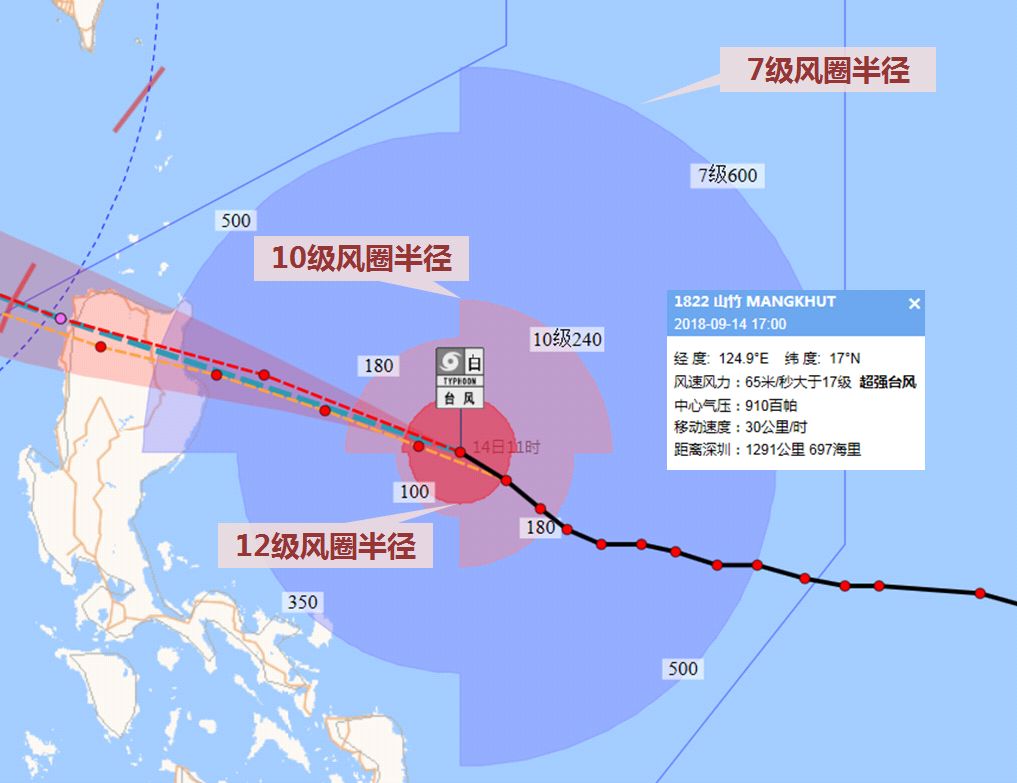 9月14日17時其位于距我市1291公里的菲律賓以東洋面,中心風力17級以上(65米/秒,相當于234公里/小時),中心最低氣壓910百帕,將以30公里/時的速度向西北方向移動。