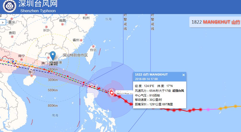 深圳市氣象臺已于2018年09月14日12時30分在全市發(fā)布臺風白色預警,預計“山竹”將可能在48小時內影響我市,全市進入臺風注意狀態(tài),遵照海事、漁政部門的防風指令或通知,做好避風準備。