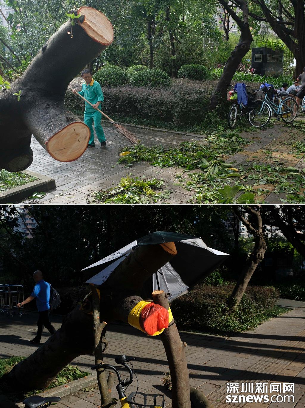 蓮花西地鐵站A出口前后對(duì)比圖(上圖:2018年9月17日,臺(tái)風(fēng)過后,路面一片狼藉,環(huán)衛(wèi)工人正在清掃。下圖 2018年9月18日下午五點(diǎn),路面清掃完畢,恢復(fù)整潔)