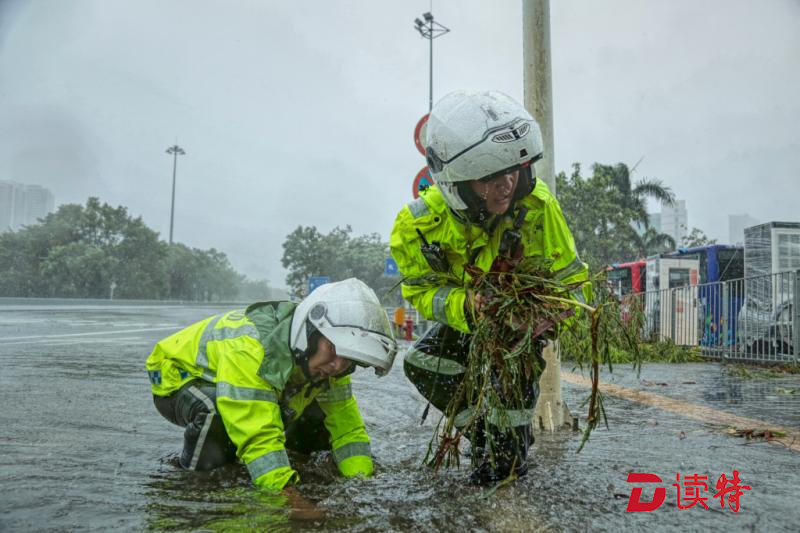 但是,眼前的情況,他們無(wú)法視而不見(jiàn)。深鹽二通道下方,羅沙路羅湖公安分局調(diào)頭口處,當(dāng)艾力軍經(jīng)過(guò)這里時(shí)發(fā)現(xiàn)由于地勢(shì)低洼路面已經(jīng)嚴(yán)重積水,他們馬上停下車,疏通下水道。一行人在風(fēng)雨中走進(jìn)機(jī)動(dòng)車道,沿著路邊只能用手在積水中摸索排水口的位置,將阻塞入水口的樹(shù)枝樹(shù)葉掏出來(lái)。但風(fēng)急雨驟,道路積水水位剛下降一點(diǎn),剛被清理的下水道又堵樹(shù)葉、樹(shù)枝等雜物堵上,他們只好不斷地進(jìn)行著重復(fù)的動(dòng)作。而此時(shí),臺(tái)風(fēng)“山竹”距離深圳接近130公里,羅湖片區(qū)測(cè)得最大陣風(fēng)達(dá)16級(jí)。