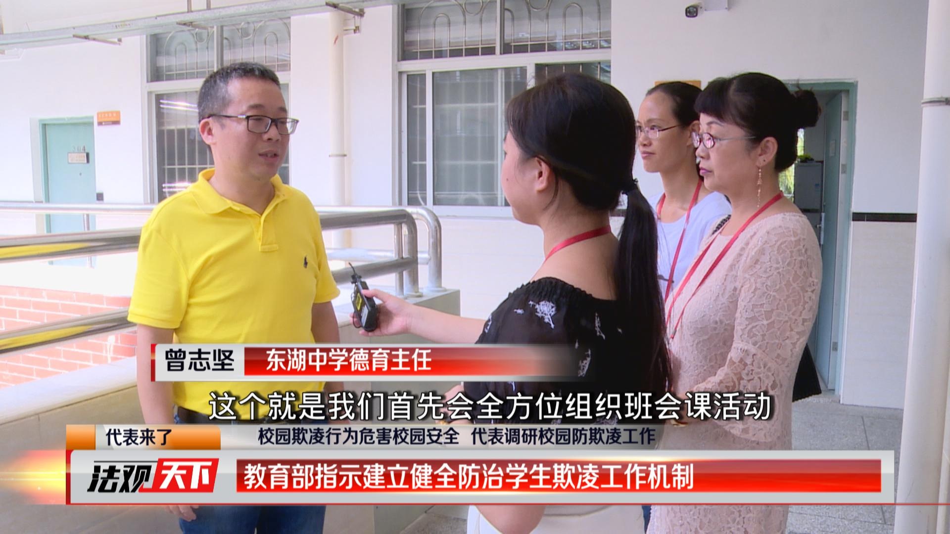 根據(jù)教育部的指示,各教育部門要協(xié)調(diào)組織相關(guān)部門建立健全防治學(xué)生欺凌工作機制,推動綜治、法院、檢察院、公安、民政、司法、人力資源社會保障等部門及共青團、婦聯(lián)、殘聯(lián)等組織落實職責(zé)分工,加強協(xié)作,共同治理。東湖中學(xué)朱海珊校長表示,通過開設(shè)校園欺凌舉報信箱、展開主題班會課、宣傳欄定期宣傳等方式,目前校園防欺凌工作取得不錯的效果,至今校園內(nèi)還未收到欺凌的舉報。