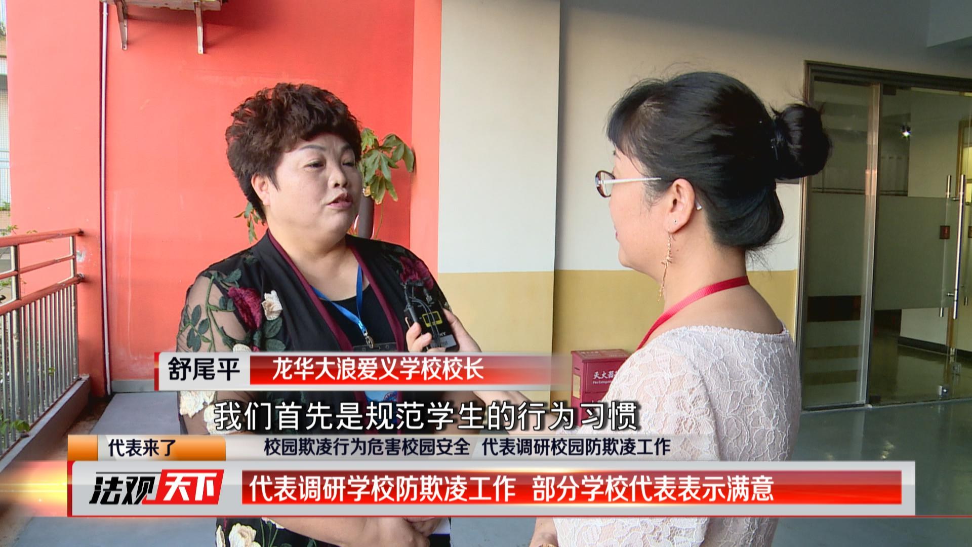 龍華大浪愛義學(xué)校,2016年12月份曾經(jīng)發(fā)生過學(xué)生被逼下跪自扇巴掌的惡性校園事件。而在該事件發(fā)生之后,學(xué)校就自發(fā)成立了教師督導(dǎo)隊,加強上下學(xué)期間校園周邊的巡查力度,及時排查隱患,防止校園欺凌事件的再次發(fā)生。胡春華、肖莉珍、宋敏三位人大代表在龍華大浪愛義學(xué)校內(nèi)視察調(diào)研,他們發(fā)現(xiàn)該學(xué)校防校園欺凌的宣傳工作值得點贊。龍華大浪愛義學(xué)校校長舒尾平告訴人大代表,在防止校園欺凌的問題上是非常積極去面對的,召開主題班會、宣傳公告、設(shè)置舉報信箱等,特別注重德育,引導(dǎo)孩子們注重品德,友愛相處,從根源上杜絕校園欺凌。