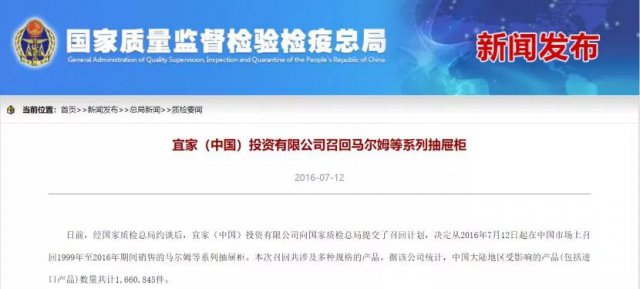 2016年7月12日,國(guó)家質(zhì)檢總局官網(wǎng)宣布,經(jīng)約談后,宜家(中國(guó))投資有限公司向國(guó)家質(zhì)檢總局提交了召回計(jì)劃,決定在中國(guó)市場(chǎng)上召回1999年至2016年期間銷售的馬爾姆等系列抽屜柜。本次召回中國(guó)大陸地區(qū)受影響的產(chǎn)品 (包括進(jìn)口產(chǎn)品 )數(shù)量共166萬(wàn)件。