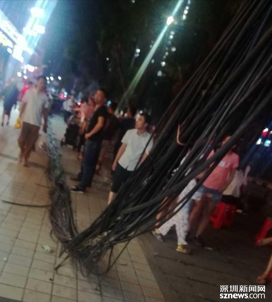 24日,據(jù)網(wǎng)友爆料稱,在寶安區(qū)石巖街道應(yīng)人石社區(qū)天寶路,路邊有電線桿受臺風(fēng)影響倒下,超100米的輸電線路拖在地上。爆料中稱:“有些電線都快碰到行人的頭了!”行人紛紛擔(dān)心該路段是否存漏電隱患。而一周過去,并沒有相關(guān)部門出面進(jìn)行處理。