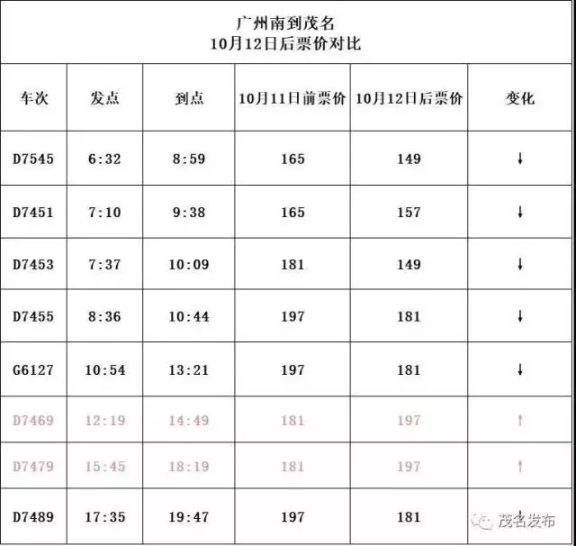 G6127次(10點54分班次)由原來的249元調整為228元;其他車次保持不變。