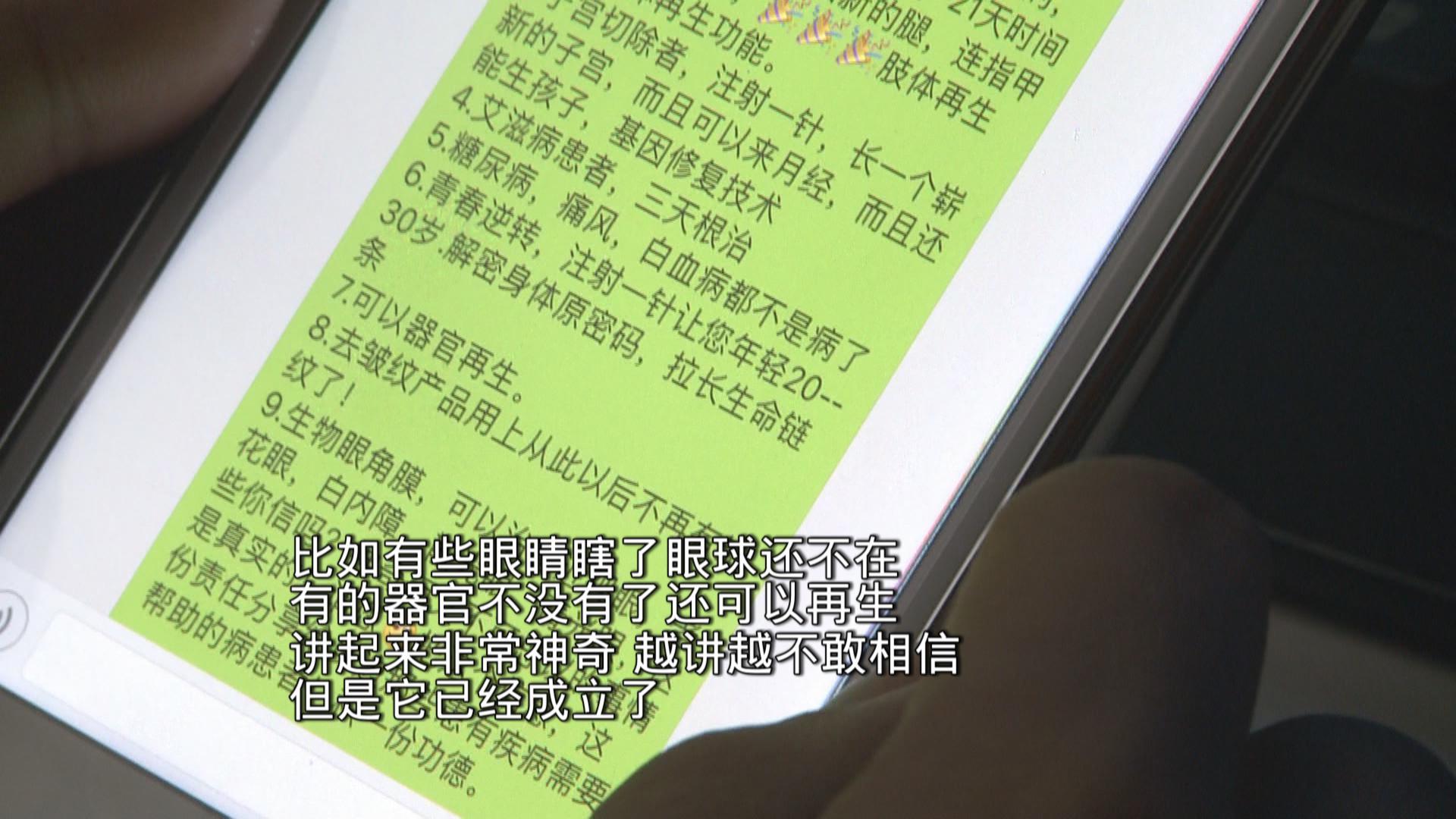 “先機,先機,改變?nèi)祟惷\的生物科技”,這條號稱改變患者命運的短信在一些微信群里流轉(zhuǎn),短信內(nèi)容號稱只要打一針,就能治愈身體上所有的疾病,其中包括癌癥、肢體再生、子宮再生、糖尿病、青春逆轉(zhuǎn)等,還呼吁將短信轉(zhuǎn)給有需要的患者,并表示向全國招募合伙人。