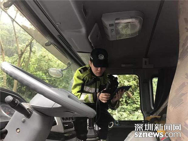 深圳交警民警檢查泥頭車駕駛員的相關證件