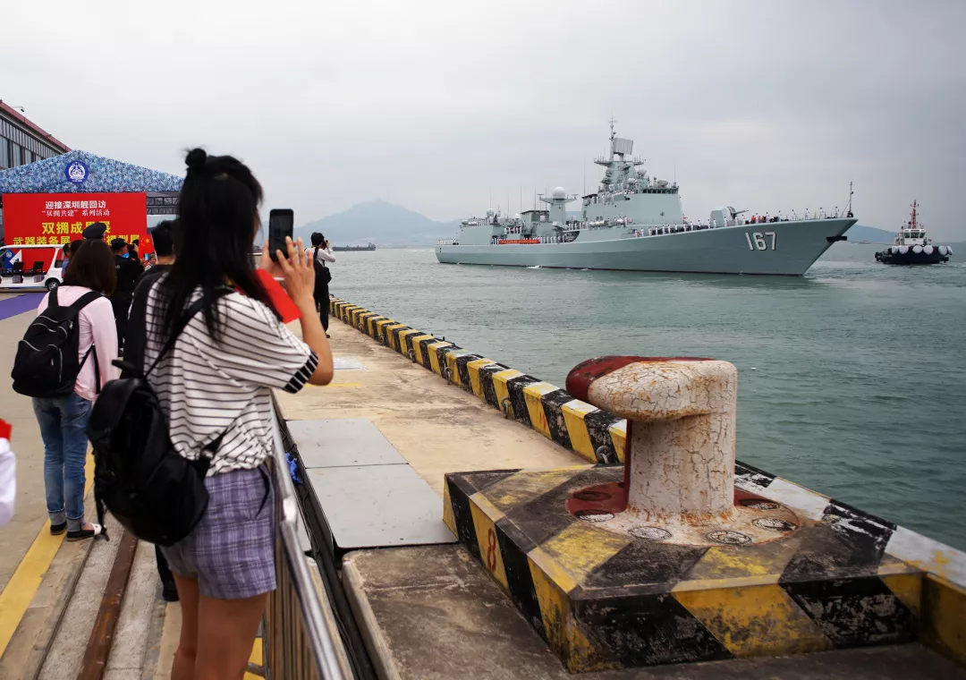 ▲深圳艦結(jié)束為期4天的訪深行程返回湛江母港,數(shù)百市民自發(fā)歡送10月20日下午3時許,蛇口郵輪母港碼頭早已聚滿了自發(fā)前來為深圳艦送行的數(shù)百名市民群眾。碼頭上,市民揮舞著五星紅旗,高呼:“歡迎深圳艦再回來!”艦艇上面,全體海軍官兵站立艦舷向市民敬禮,隨著一聲長長的汽笛聲,海軍深圳艦艦艏犁開海面,拖著長長的尾跡,帶著深圳第二故鄉(xiāng)人民的殷殷離別之情,起航駛向湛江母港。