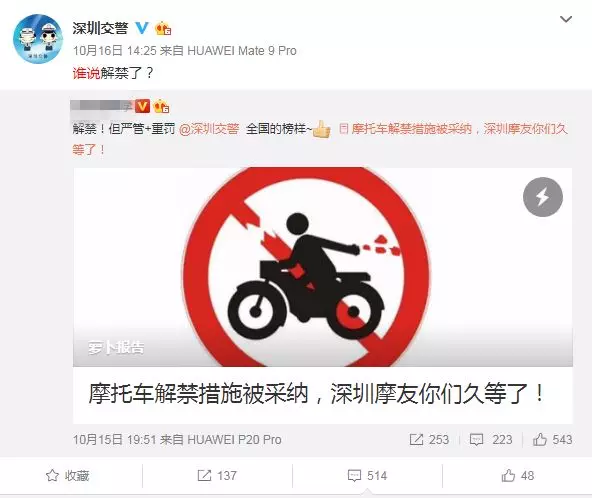 深圳新聞網10月27日訊(記者 劉婷)近日出現一些關于“摩托車解禁”的文章引得“深圳摩友們”瘋狂躁動,一時間關于“深圳解禁摩托”的消息在朋友圈、微博等流傳開來。深圳交警就此正式辟謠:假的!