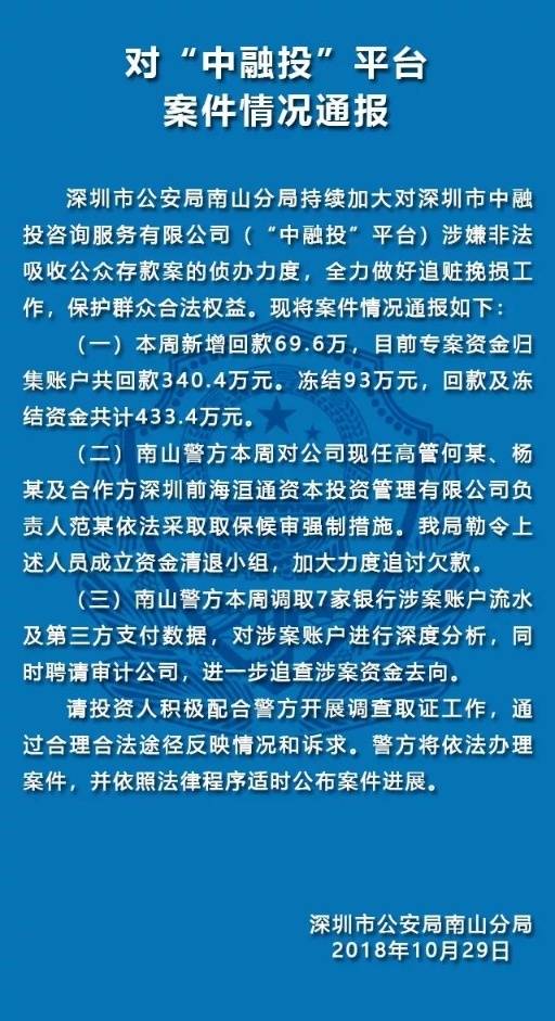 10月29日,深圳南山公安通報(bào)五家涉嫌非法集資犯罪的P2P平臺案件情況。五家平臺分別是“中融投”“投之家”“零錢罐”“利民網(wǎng)”“金融圈”平臺。