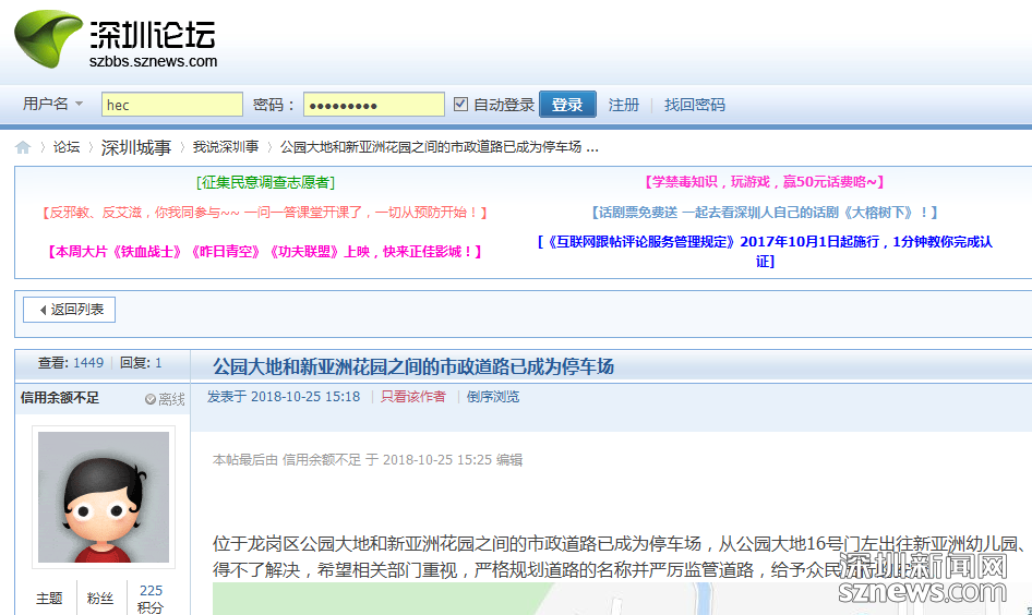 網(wǎng)友“信用余額不足”在深圳論壇發(fā)帖