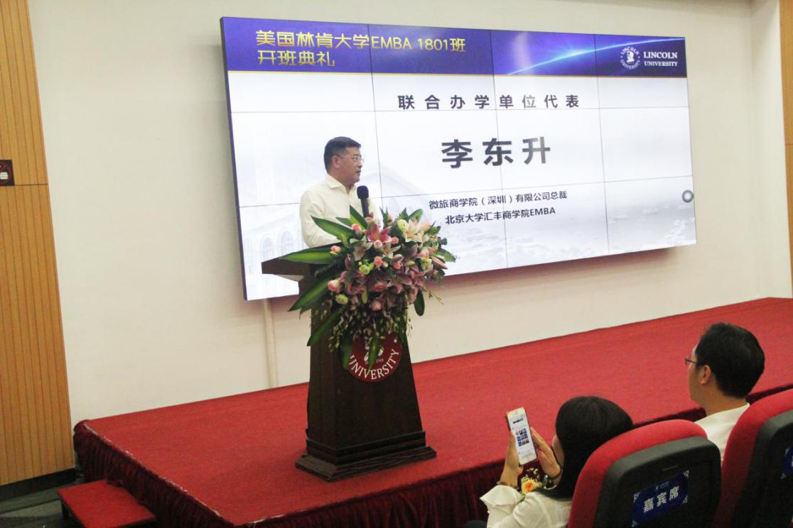 美國林肯大學(xué)的發(fā)展也離不開合作辦學(xué)單位的支持,聯(lián)合辦學(xué)合作單位代表李東升先生,分享了他就讀EMBA的心得,同時(shí)也對(duì)新教育的理念、新時(shí)代企業(yè)發(fā)展的模式提出了自己的見解。