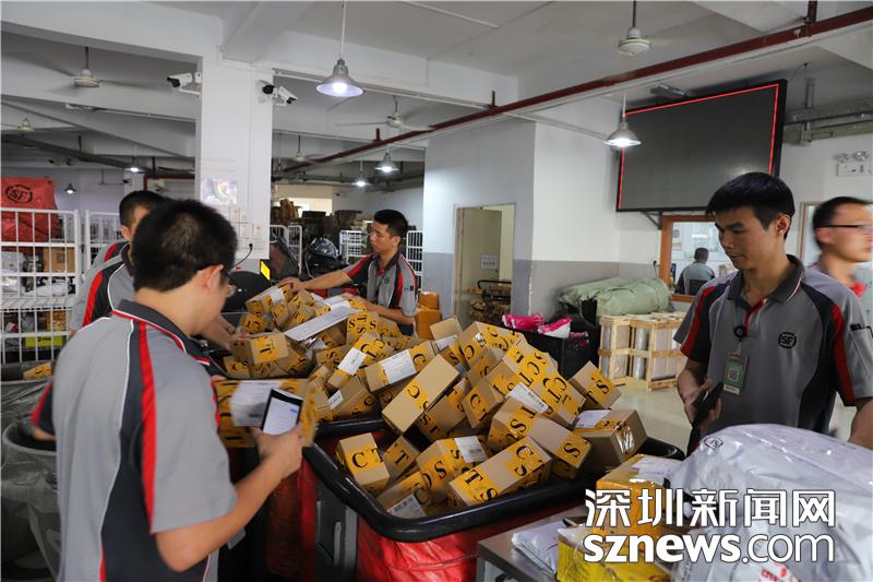 在田貝營運部內(nèi),順豐員工使用手機掃碼后快速分揀快遞