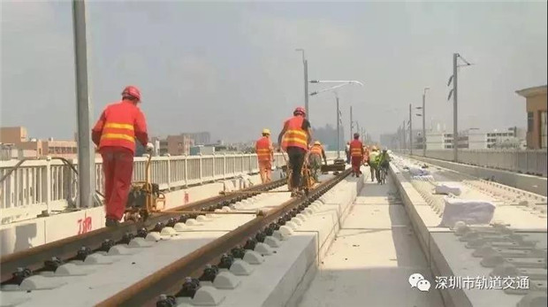 從施工現(xiàn)場可以看到,鋪軌機(jī)把長軌放入無碴道床就位,當(dāng)鋼軌最后精準(zhǔn)就位后,要求正負(fù)誤差不超過1毫米。目前鋪軌進(jìn)度至少每天7公里,11日上午從金沙站開始不停歇作業(yè),到下午兩點(diǎn)鋪軌作業(yè)已臨近深圳。項(xiàng)目建設(shè)者表示,大約本月20號鋪設(shè)到深圳機(jī)場北站。