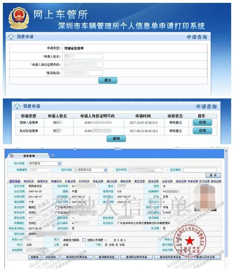 ②登入網(wǎng)上深圳交警 →網(wǎng)上車管所 →駕駛證業(yè)務(wù) →在線申請(qǐng) →駕駛證信息單查詢及打印、駕駛?cè)税踩鹿市庞帽聿樵兗按蛴?/p>