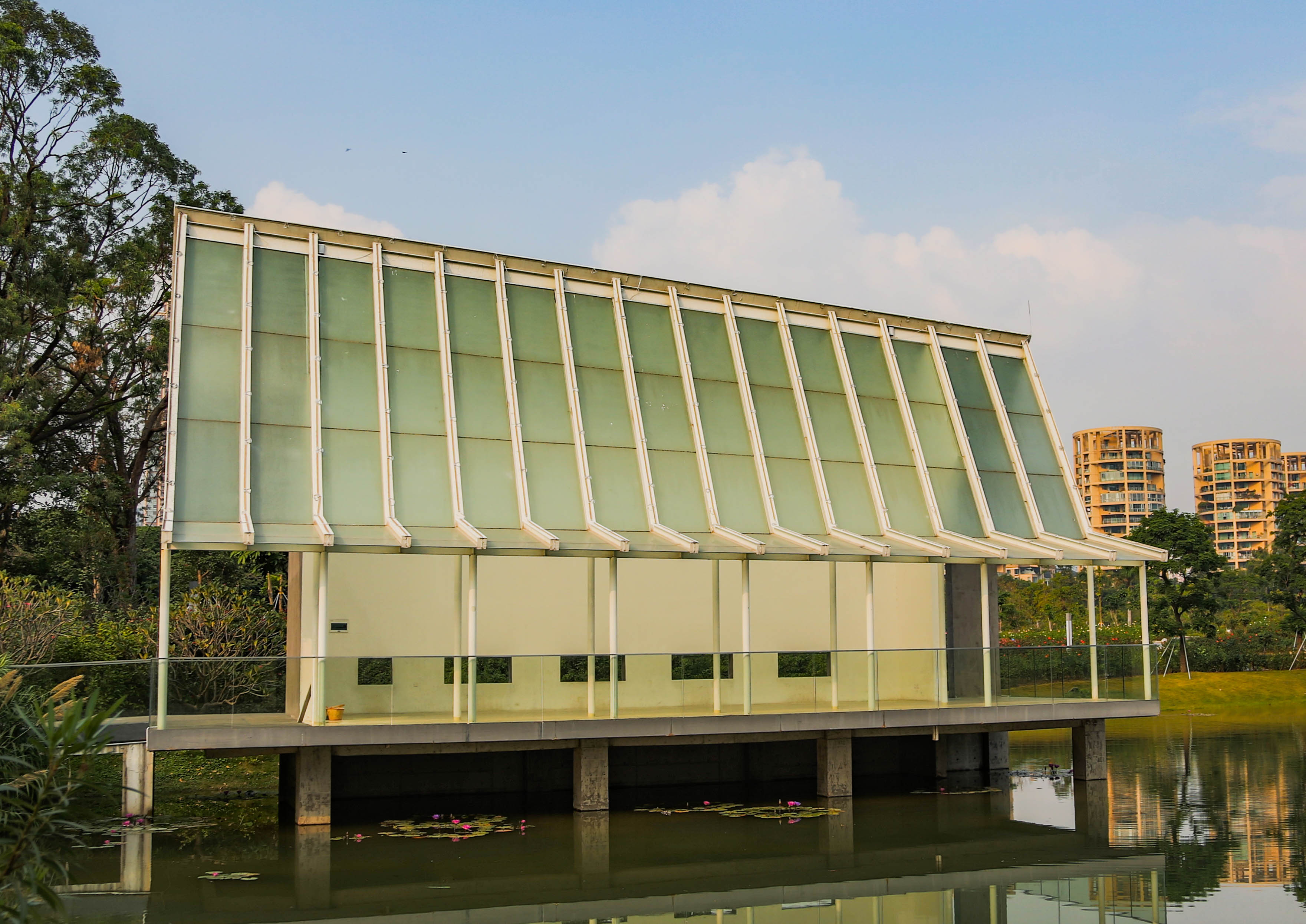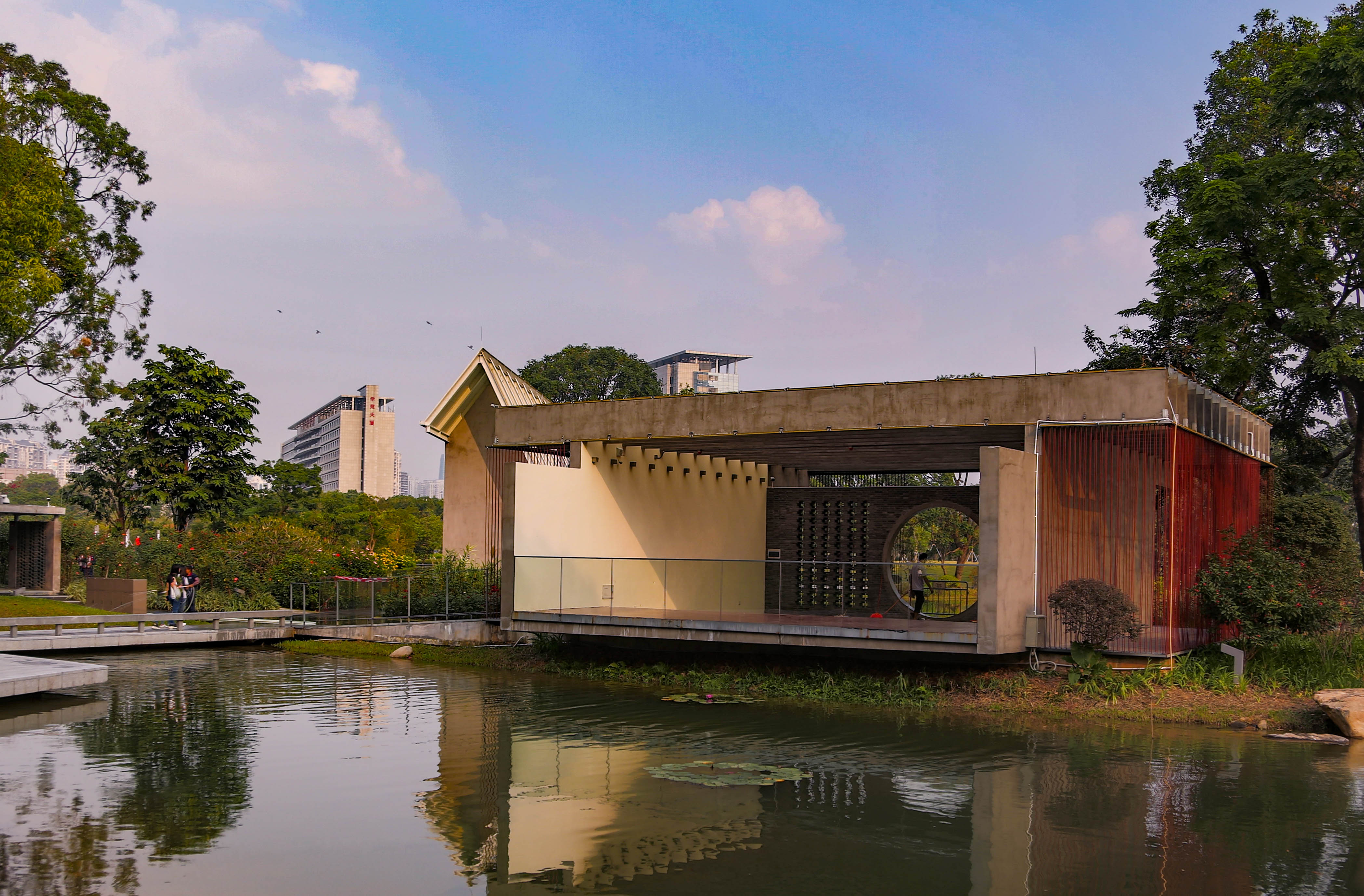 在湖對岸遠望兩座風格迥異的中西式婚姻禮堂。