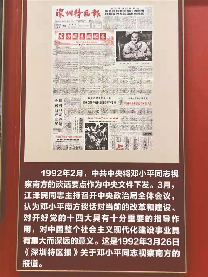 ▲展覽展出的1992年3月26日刊登長(zhǎng)篇通訊《東方風(fēng)來滿眼春》的《深圳特區(qū)報(bào)》頭版圖片。