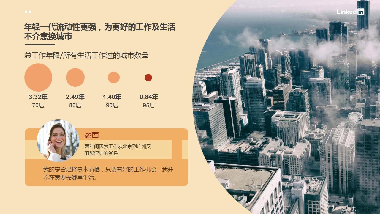 在此前的調(diào)研中,領(lǐng)英數(shù)據(jù)顯示90/95后年輕職場人的平均在職時間顯著降低,為了追求更好的工作機會他們不介意頻繁跳槽。而這樣的高流動性同樣也體現(xiàn)在城市的變動上。以職場人總工作年限/所有生活工作過的城市數(shù)量為衡量依據(jù),領(lǐng)英大數(shù)據(jù)顯示:職場人城市間流動頻率,呈現(xiàn)出隨年齡的降低而增高的趨勢,年輕一代在城市方面的流動性越來越強。