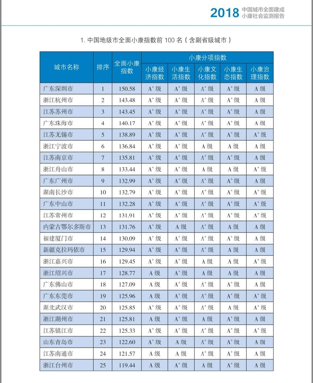 中國地級市全面小康指數(shù)前100名(含副省級城市)之前25名。