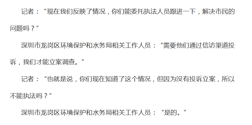 以下是記者與深圳市龍崗區(qū)環(huán)境保護(hù)和水務(wù)局信訪部門工作人員的部分對(duì)話: