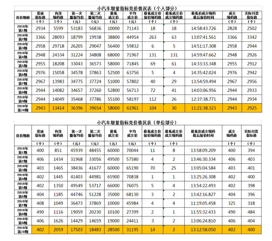 據(jù)悉,10月份個人指標(biāo)最低成交價58000元,平均成交價61961元。