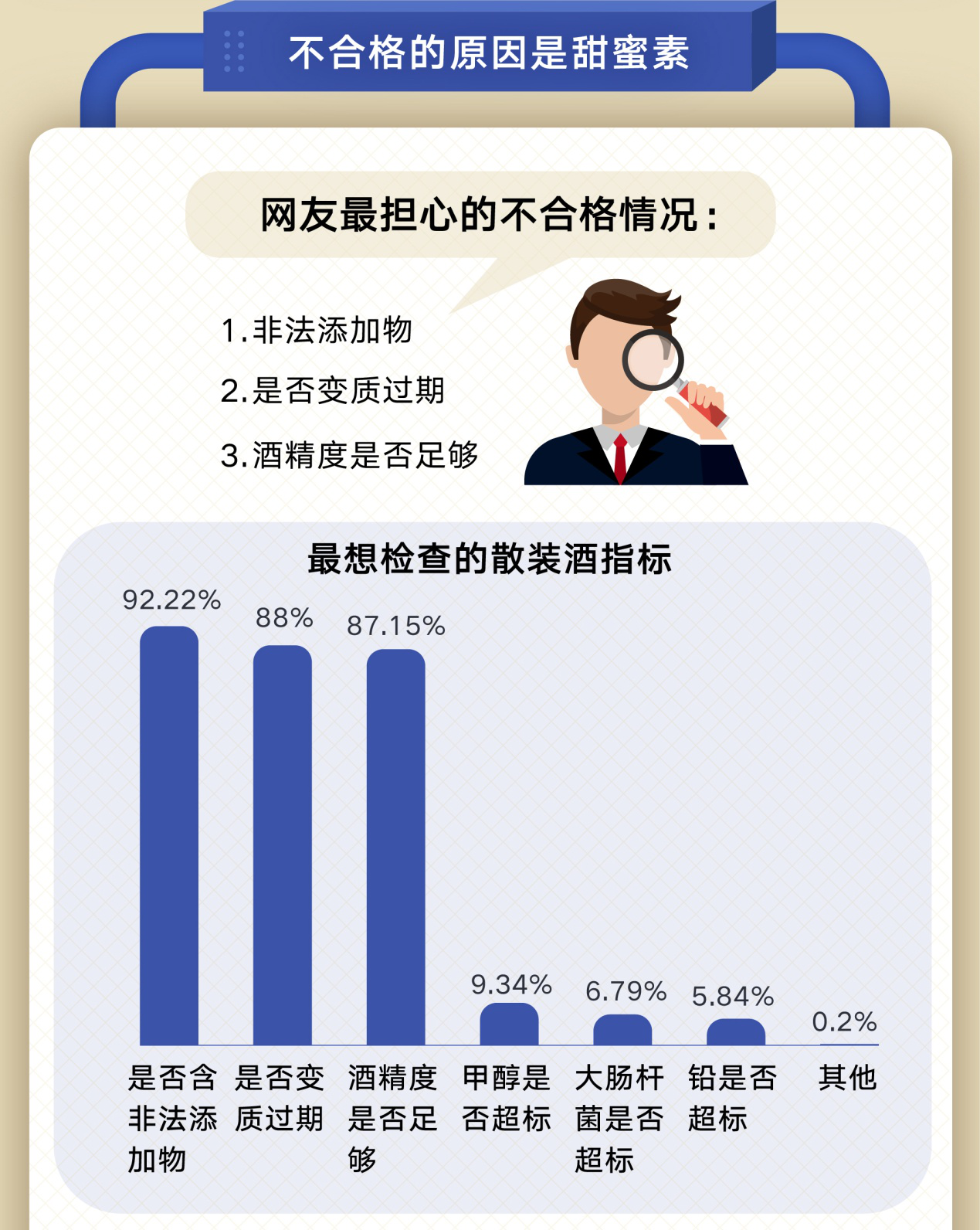 網(wǎng)友最想檢查的散裝酒指標(biāo)有哪些?根據(jù)調(diào)查數(shù)據(jù),網(wǎng)友最擔(dān)心的還是在散裝酒中的非法添加物;其次是酒水是否變質(zhì)過期;排在第三位的是酒精度是否足夠。