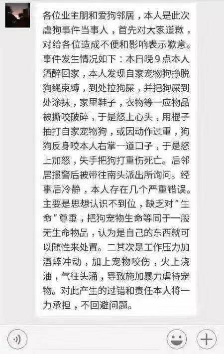 當(dāng)天深夜,男子在業(yè)主群中道歉,稱自己晚上9點醉酒回家,發(fā)現(xiàn)自家寵物狗掙脫狗鏈,到處拉屎還將家里的鞋子、衣物撕咬破碎,抽打自家寵物狗時,又被反咬一口,才會失手將狗打成重傷,同時男子表示“對此產(chǎn)生的過錯和責(zé)任本人將一力承擔(dān),不回避問題。”