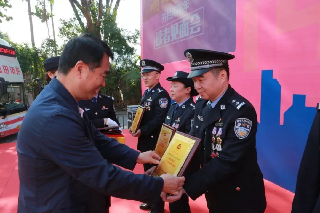 深圳市公安局與深圳特區(qū)報合辦的“每日警星”專欄讀者粉絲見面會在福田分局開放點火熱開展,來自深圳警隊刑偵、掃黑攻堅、治安、社區(qū)、特警、交警、預審等各個崗位的14名“每日警星”代表現(xiàn)場激情合唱中國人民警察警歌;徐文海與深圳報業(yè)集團黨組副書記、副社長、總編輯周斌共同為“每日警星”代表頒發(fā)紀念牌。
