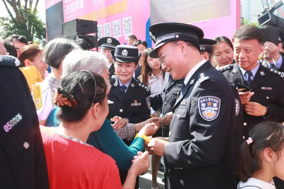 儀式后,深圳市副市長、公安局長徐文?,F(xiàn)場為來參觀活動的老人和小孩佩戴了“黃手環(huán)”,陽光的顏色,給人溫暖,讓人安心,傳遞了正能量。