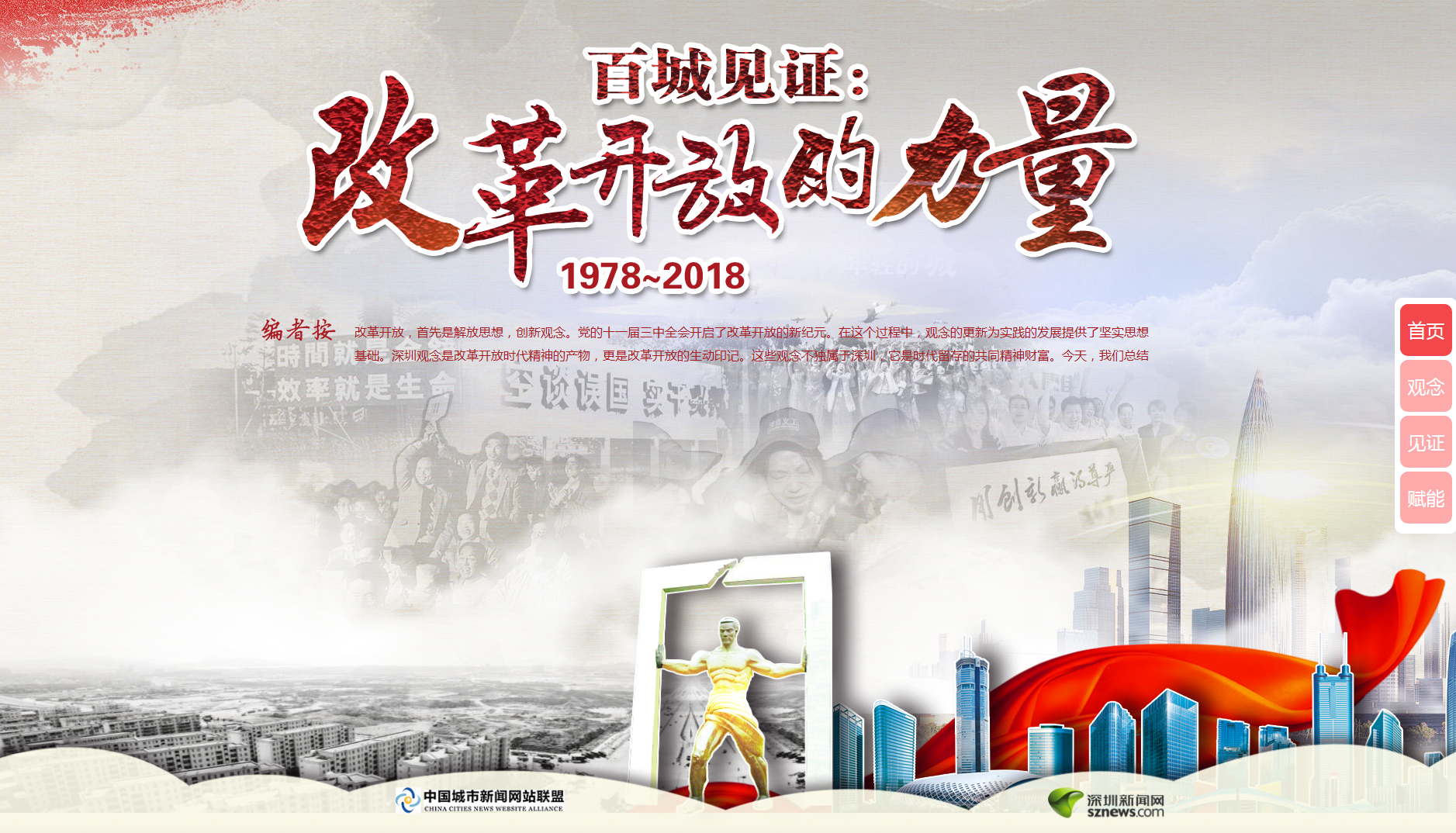 此次活動由中國城市新聞網(wǎng)站聯(lián)盟主辦,深圳新聞網(wǎng)承辦,活動在今年10月中國城市新聞網(wǎng)站聯(lián)盟總編輯聯(lián)席會上正式啟動。專題網(wǎng)頁采用全新H5技術(shù),用歷史原圖、視頻、音頻和文字交互呈現(xiàn)方式,詮釋改革、實干、擔(dān)當、文明、開放、創(chuàng)新等深入民心的改革開放觀念,并發(fā)動網(wǎng)盟近百家成員單位網(wǎng)站,深入挖掘當?shù)爻鞘懈母镩_放的生動案例和故事,報道這些代表性觀念對所在城市發(fā)展的巨大影響,共同描繪改革開放40年的生動畫卷。