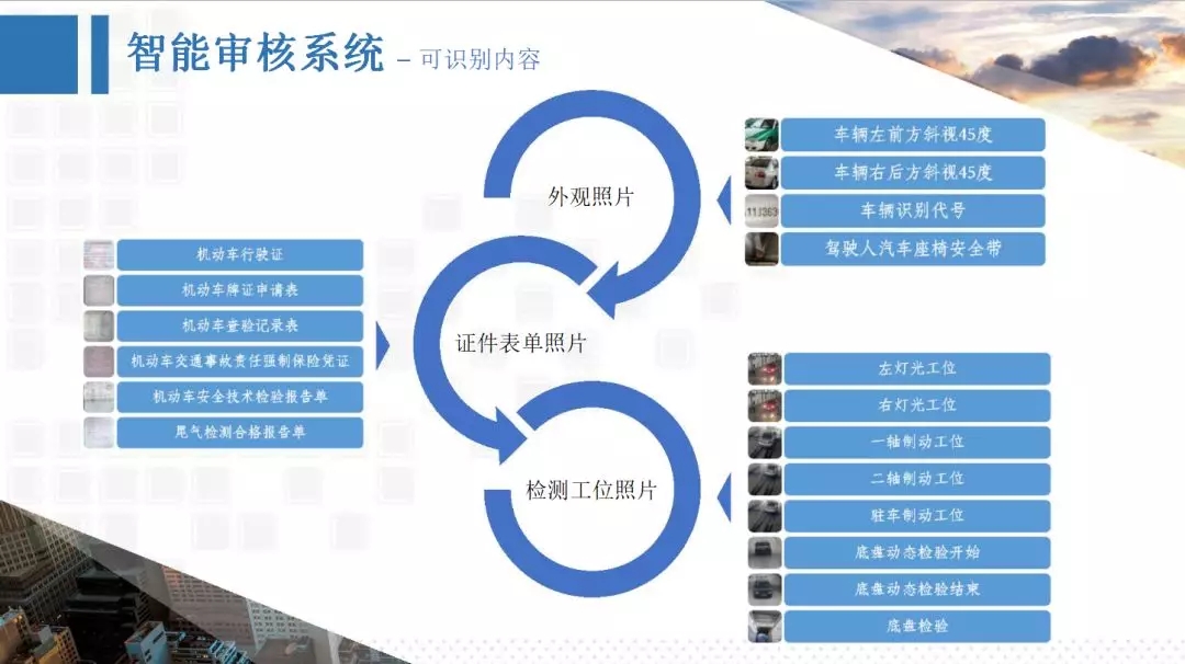 可識(shí)別車檢過程中的全部圖片、視頻及文字材料, 包含外觀照片、工位視頻,證件表單3大版塊共18項(xiàng)檢測(cè)內(nèi)容。
