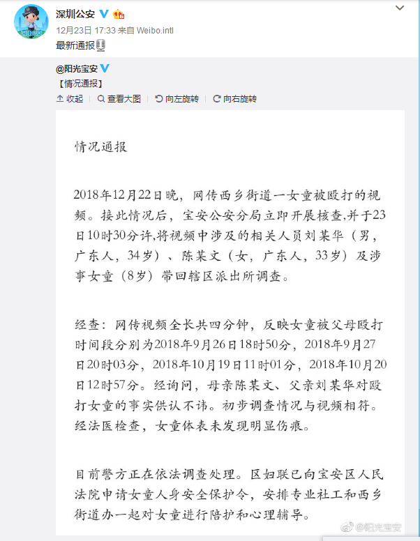 8歲女童遭家暴事件最新消息是,深圳警方對此展開了調(diào)查處理。寶安區(qū)婦聯(lián)已向?qū)毎矃^(qū)人民法院申請女童人身安全保護(hù)令。寶安公安局的調(diào)查結(jié)果顯示,網(wǎng)上流傳的3分鐘視頻分別是今年9月、10月的四個時間段拍攝,女童父母對毆打女兒的事實(shí)供認(rèn)不諱,法醫(yī)檢查女童體表未發(fā)現(xiàn)明顯傷痕。