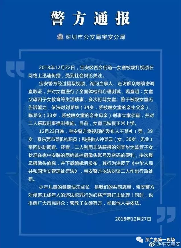 12月27日晚19時(shí)許深圳警方通報(bào)“父母虐童”案處理結(jié)果:女童父母被采取刑事強(qiáng)制措施 視頻發(fā)布人被行政處罰