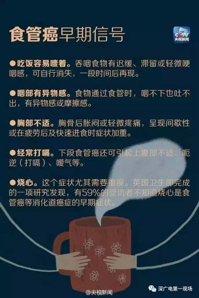 這個溫度既不會過度刺激食道、腸胃,也不容易造成血管收縮。所以,在進(jìn)食的時候,建議把溫度過高的食物、熱飲先放置一段時間。當(dāng)然了,食管癌也并不是不治之癥,關(guān)鍵在于早發(fā)現(xiàn)早治療。