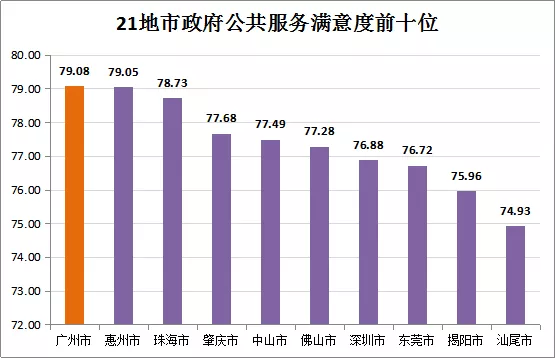 在調(diào)查的122個(gè)縣(市、區(qū))中,越秀區(qū)政府公共服務(wù)總體滿意度最高(83.95分),連續(xù)五年在縣(市、區(qū))評(píng)價(jià)中居首;隨后依次為:天河區(qū)、惠城區(qū)、端州區(qū)、光明區(qū)、南山區(qū)、斗門區(qū)、從化區(qū)、南沙區(qū)、順德區(qū),居前十位的均處于珠三角地區(qū),是我省公共服務(wù)建設(shè)標(biāo)桿地區(qū)。