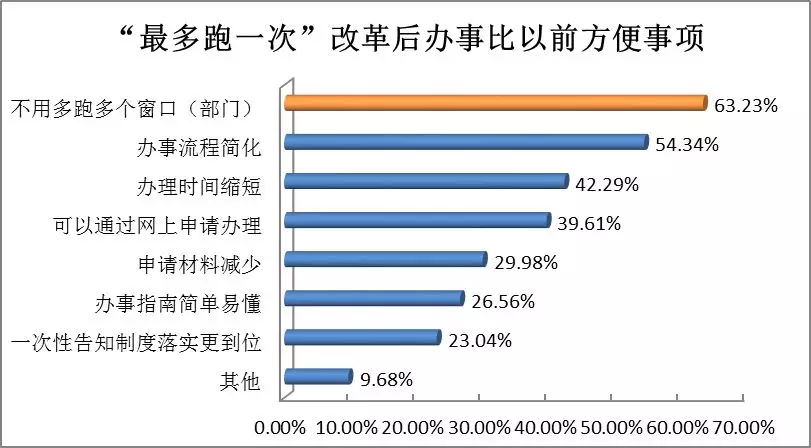 86.69%的受訪者認(rèn)為“最多跑一次”改革實(shí)施后到政府辦事比以前更方便了,方便事項(xiàng)排在第一位的是“不用多跑多個(gè)窗口(63.23%),其次依次為辦事流程簡化(54.34%)、辦理時(shí)間縮短(42.29%)。