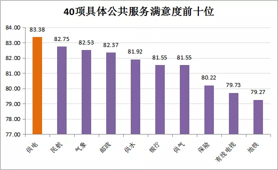 在40項(xiàng)具體公共服務(wù)中,公眾對(duì)供電服務(wù)的滿意度依然最高,得分為83.38分,連續(xù)十年位居全省40項(xiàng)政府公共服務(wù)第一位,廣州、深圳、中山等21個(gè)地市供電服務(wù)的滿意度也均位列各市公共服務(wù)首位。空氣污染治理(70.16分)、垃圾回收與處理(69.37分)、水環(huán)境治理(68.46分)、污水處理(68.42分)、噪聲控制效果(67.43分)的滿意度較低。