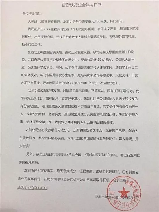 1月20日,深圳市螃蟹網(wǎng)絡(luò)科技有限公司創(chuàng)始人尹柏霖發(fā)文控訴,前員工燕某在游戲上線測(cè)試當(dāng)天(2017年12月15日),鎖死服務(wù)器與電腦,并惡意失蹤,致公司損失慘重。尹柏霖稱,“我們上線不了也測(cè)試不了,等新員工到職后熟悉新代碼又是幾個(gè)月過去了。”