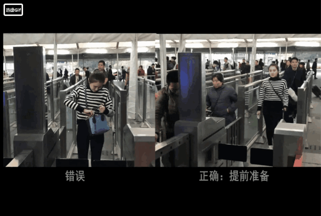 通過自助驗證閘機或人工檢票進站時,應提前準備好證件、車票,避免耽誤個人進站時間、其他旅客時間。