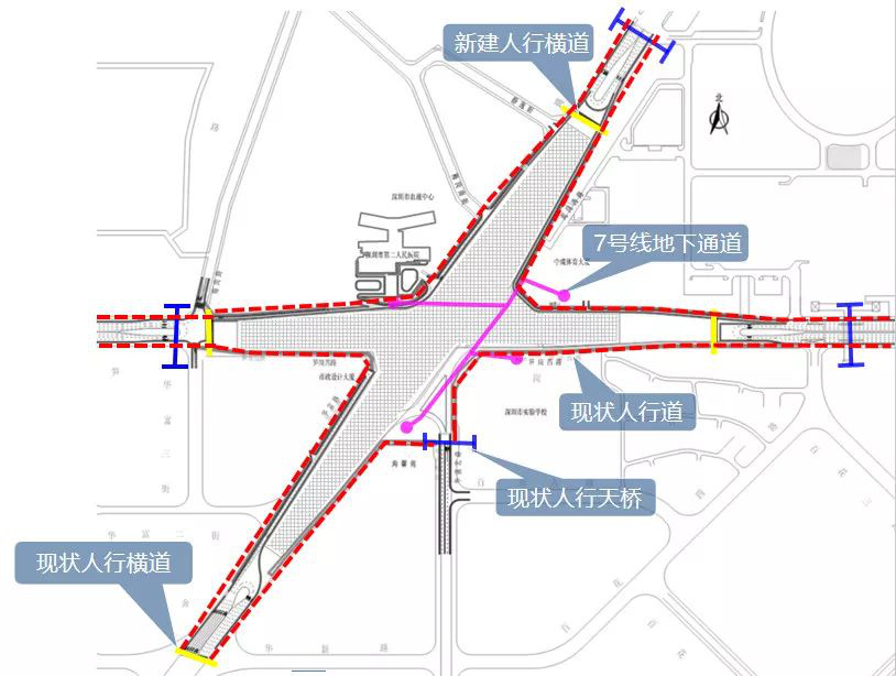 同時,在筍崗西路、華富路、泥崗西路、華強北路靠近立交的一端設(shè)置掉頭開口,各方向車輛可在此掉頭繞行。
