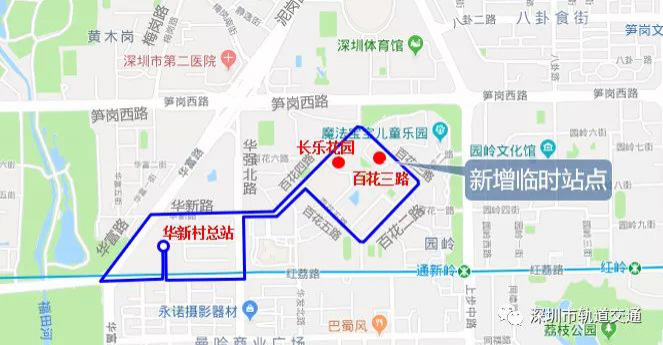 增設(shè)14個臨時??奎c(花卉世界臨時站、華新村臨時站、群星廣場臨時站、計生中心臨時站、建設(shè)集團臨時站、體工宿舍、華富北屋村、長樂花園、百花三路)。