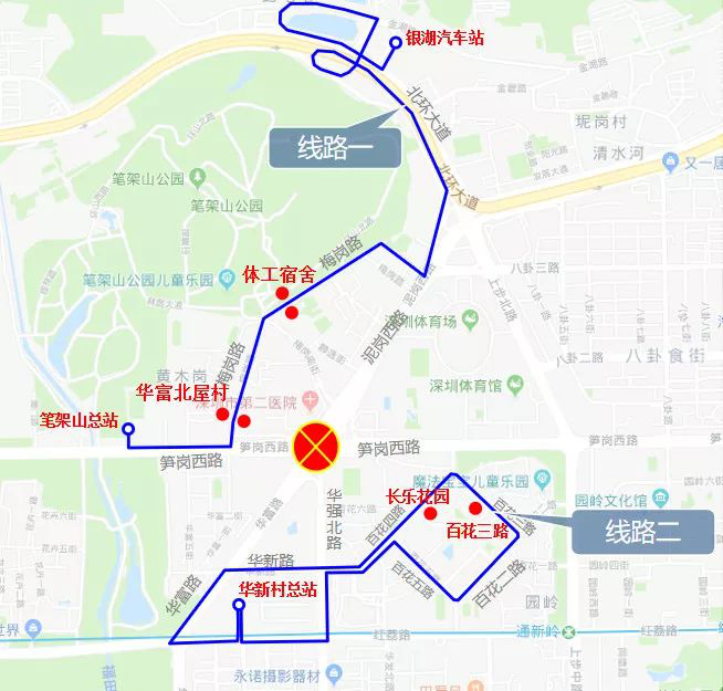 原經(jīng)華富路北行往醫(yī)院交通調(diào)整為:皇崗路 -筍崗西路 -梅崗路 -梅崗南街上步路 -泥崗西路。