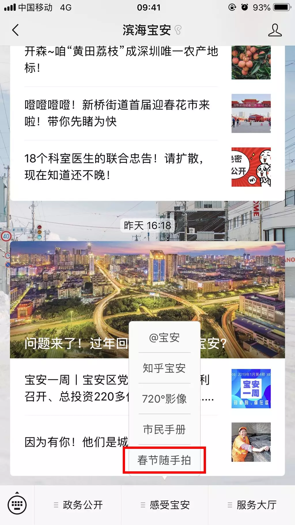 1、掃碼關(guān)注“濱海寶安”微信公眾號,在下方菜單欄中點擊“春節(jié)隨手拍”參與活動。