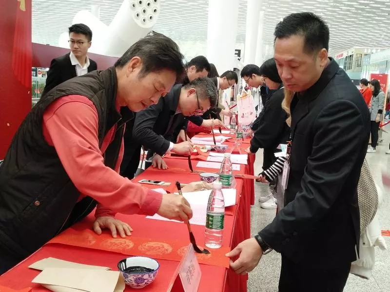 ▲越來(lái)越多的旅客來(lái)到送春聯(lián)活動(dòng)現(xiàn)場(chǎng),選好自己心儀的話語(yǔ),由書法家們揮毫寫下。